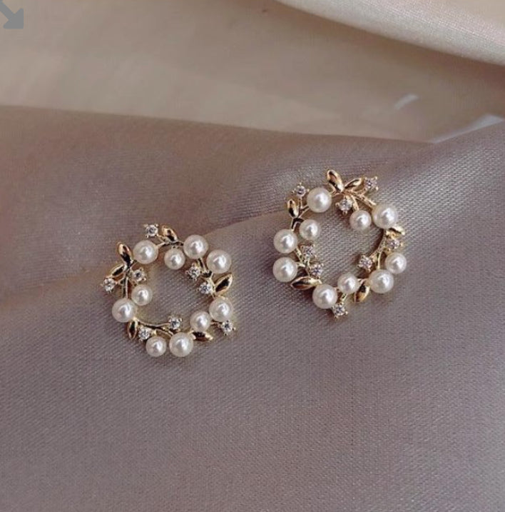 Kolczyki złote wianki z perłami i kwiatami