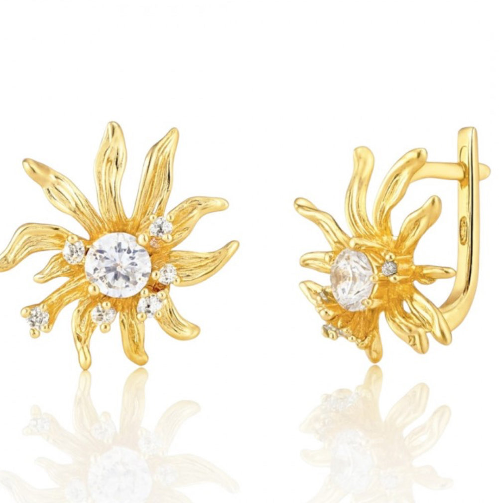 Odkryj radosną elegancję z naszymi wyrafinowanymi kolczykami w kształcie słoneczników z lśniącymi cyrkoniami. Te wyjątkowe kolczyki łączą w sobie kwiatowy design z luksusowym wykończeniem, tworząc biżuterię, która przyciąga wzrok i podkreśla Twoją pozytywną energię.